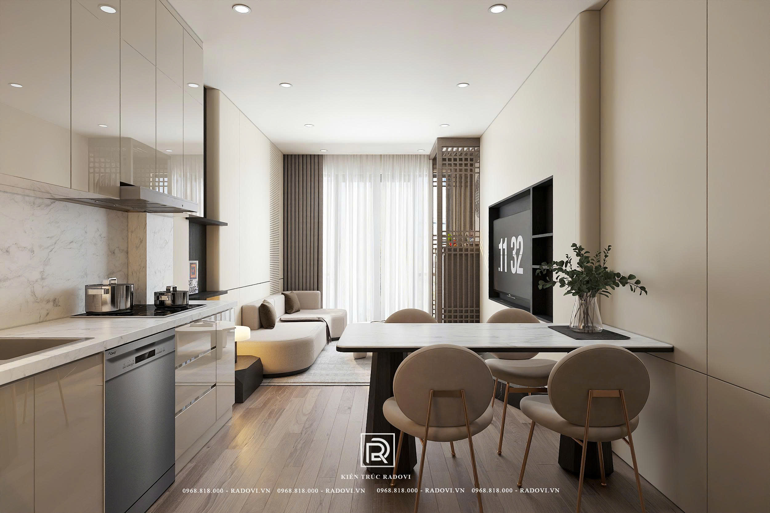 Phòng khách và bếp ăn thường được kết nối liền mạch với khu vực tiếp khách được bố trí một chiếc sofa dài với kiểu dáng đơn giản, gọn gàng. vách tường sau sofa phẳng, kết hợp những thanh ngang nhỏ tinh tế vừa làm điểm nhấn vừa tận dụng làm kệ trưng bày. Đối diện là tivi treo tường giúp tiết kiệm diện tích, mang lại sự thông thoáng cho không gian. Liền kề phòng khách là bàn ăn 4 ghế nhỏ gọn, đủ ấm cúng cho gia đình. Khu bếp được thiết kế hiện đại với bề mặt dễ lau chùi, đảm bảo tính tiện nghi và sạch sẽ trong quá trình sử dụng. Toàn bộ nội thất sử dụng tông màu be sáng, vừa tinh tế, vừa tạo cảm giác nhẹ nhàng và thoáng đãng cho căn hộ.